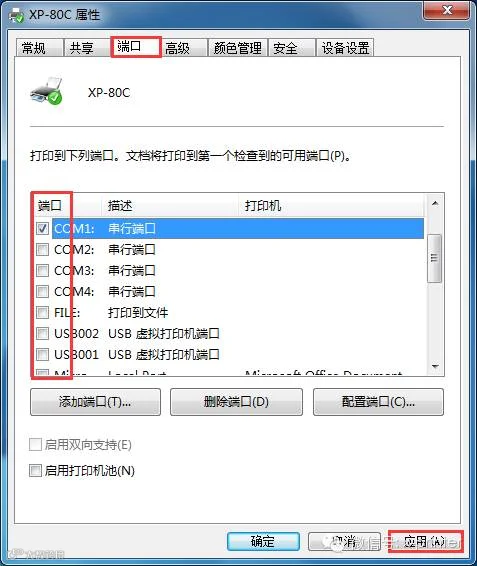 10、进行选择打印机对应的端口,再点“应用”。如图: