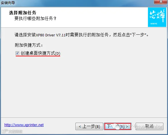 4、在桌面创建快捷方式,以方便下次直接安装,“下一步”。如图: