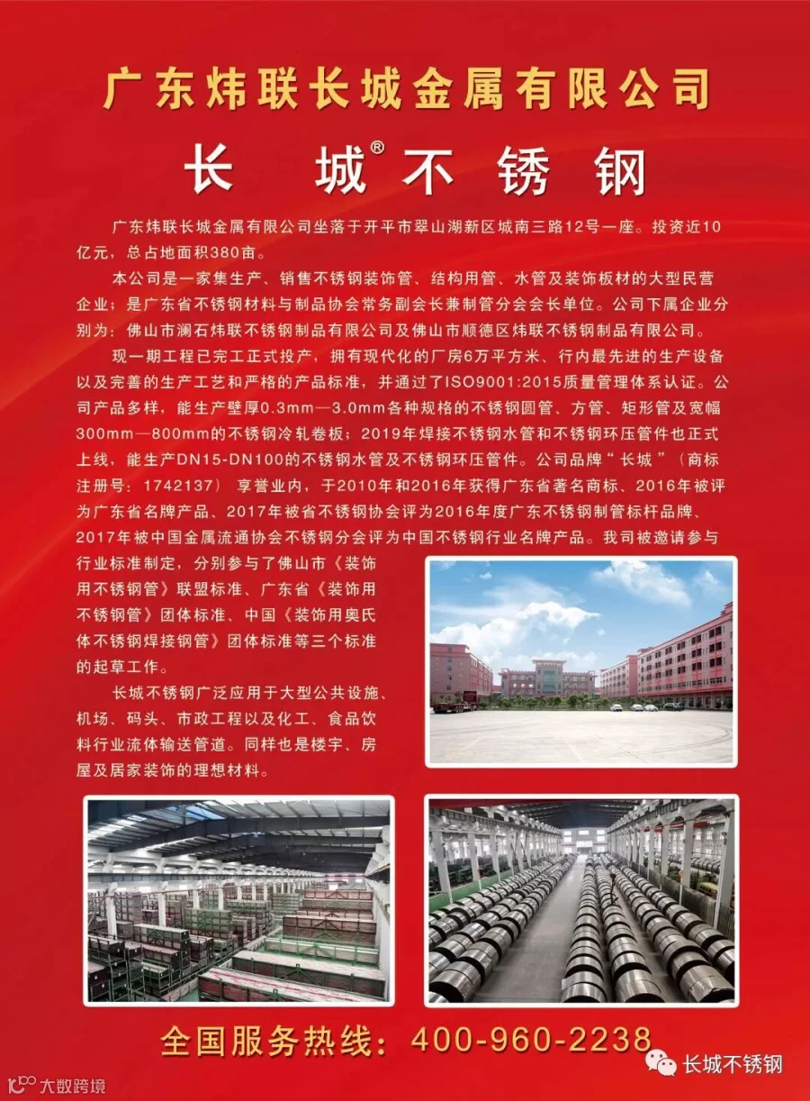 我是一家集生产、销售不锈钢管材的大型民营企业。能够生产壁厚0.3mm~3.0mm 的各种规格的不锈钢圆管、方管、矩形管以及多种规格的不锈钢板。通过了ISO9001:2015 质量管理体系认证。并荣获广东省著名商标称号,广东省名牌产品称号。