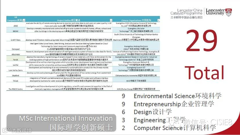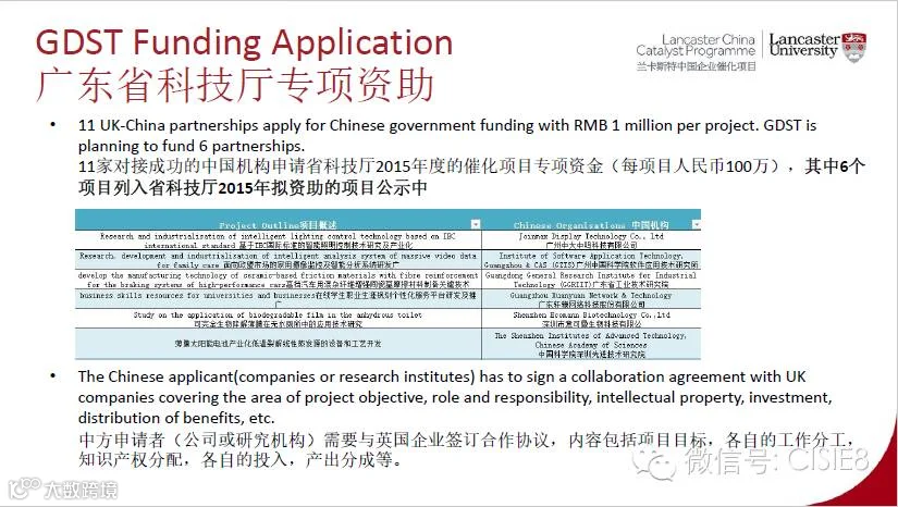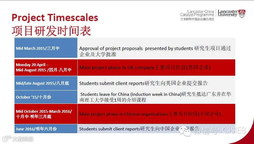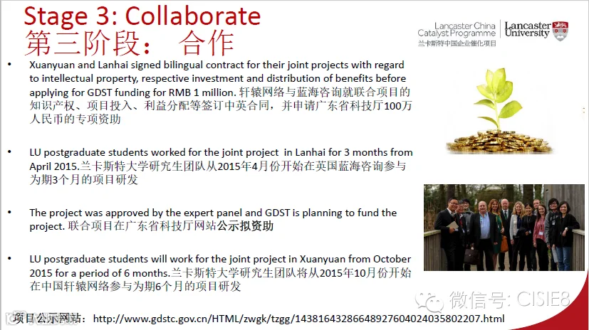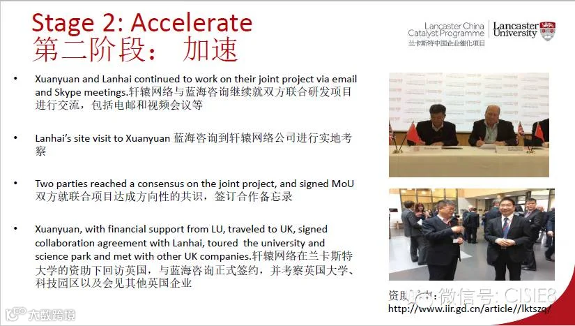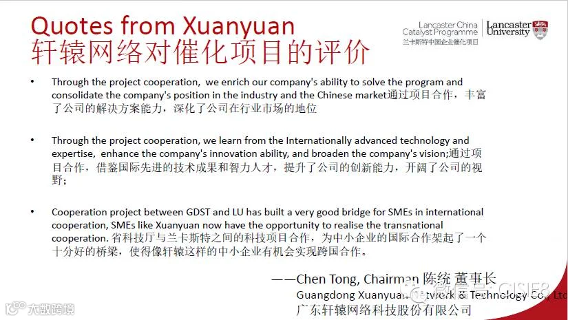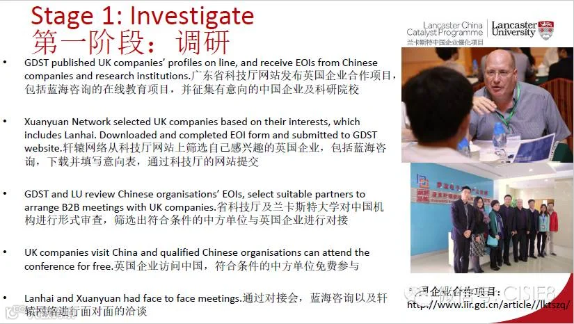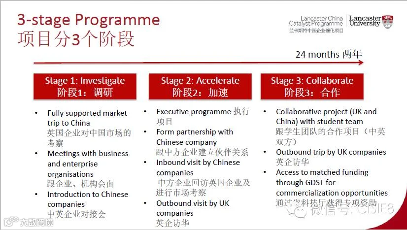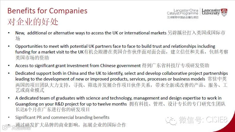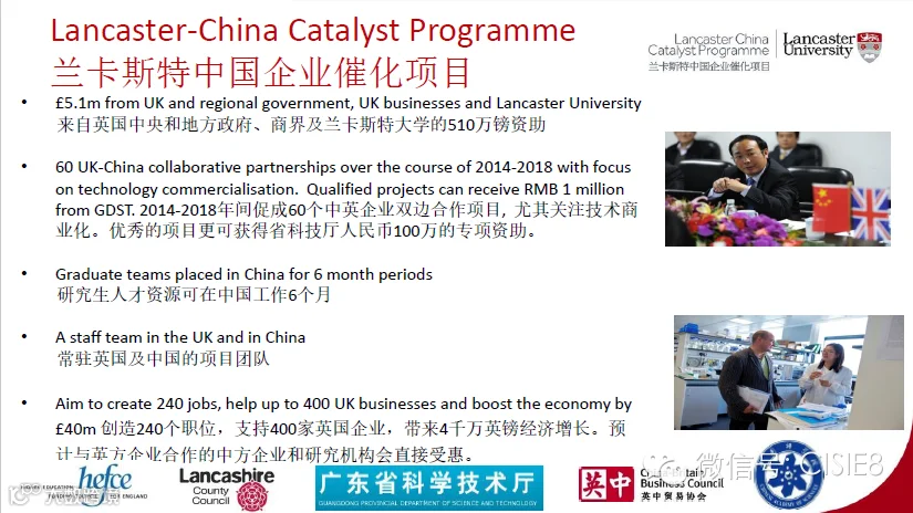 该项目将在两地政府的推动下,通过多次对接交流和双边考察,明确合作性的研发或技术商业化项目,兰卡斯特大学将派驻专业研究生参与研发,提供长达12个月的专业支持,两地政府也将为双方企业提供相应的经济支撑。本轮催化项目,兰卡斯特大学选取了10家英国企业(详见附件1),他们将在12月份与青海企业进行对接交流。