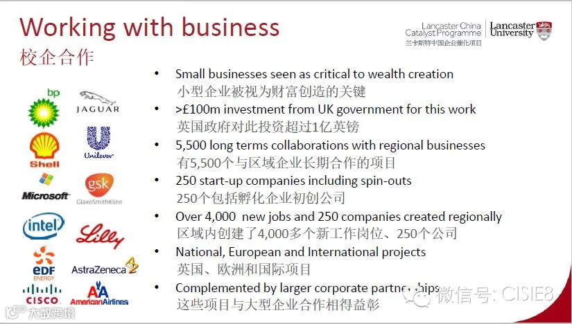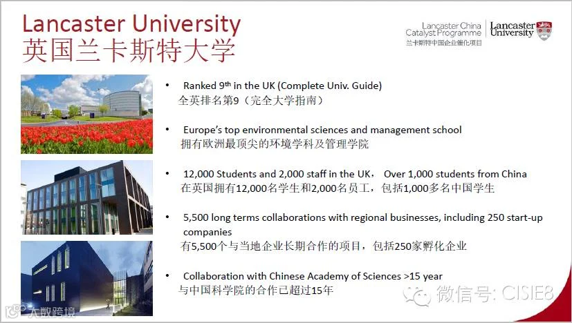 本次考察的邀请单位英国兰卡斯特大学是英国著名研究型学府,在环境科学、生物医学、新能源、食品科学等领域拥有多项创新技术,在合作研究、与产业界合作方面也有丰富经验,为充分发挥自身强大的孵化能力,联动起中英两国高新企业,兰卡斯特大学推出了中国企业催化项目。