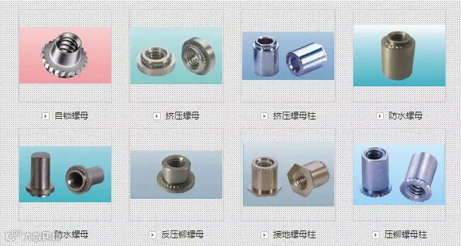 从公司成立起,公司的技术革新就带领了铆接领域的发展趋向并不断推动其发展,目前主要产品有:开口型抽芯铆钉、封闭型抽芯铆钉、双鼓型抽芯铆钉、拉丝型抽芯铆钉、环槽铆钉、大帽沿抽芯铆钉、彩色抽芯铆钉等系列铆钉;拉铆螺母系列;压铆螺母、压铆螺钉、压铆螺柱、松不脱、天线螺母等压铆件系列;焊接螺母、焊接螺柱、焊接螺钉系列;螺丝螺母、平弹垫等标准件系列;精铸、压铸系列;非标产品CNC/自动车加工件;手动、气动工具枪等系列产品。产品材质有铝、铜、钢、不锈钢等。