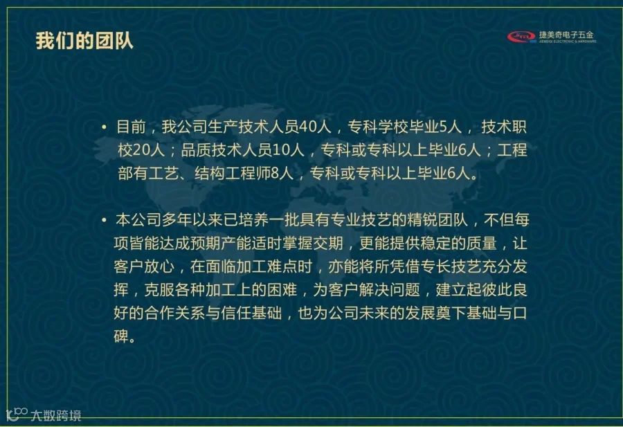 深圳捷美奇于2006年8月公司注册正式成立,设址于深圳宝安区松岗燕川 2009年通过ISO9001-2008体系资格认证
