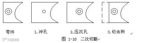 二次切割也叫二次下料,或者补割(工艺性极差,设计时应尽量避免)。二次切割就是拉伸特征对材料有挤料变形现象、折弯变形较大时,加大落料,先成型,再补割孔或外形轮廓,以达到去除预留材料,获得完整正确结构尺寸。 应用:拉伸凸台离边缘较近等,都必须补割。例说明,如图1-16所示。