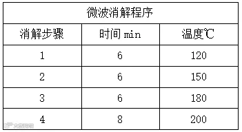 称取土壤样品0.2g于微波消解罐中加入4ml的硝酸,1ml的盐酸,1ml的氢氟酸和0.5ml的高氯酸,拧上盖子,放置于微波消解仪中。设置好程序中的参数: