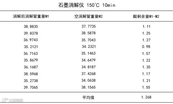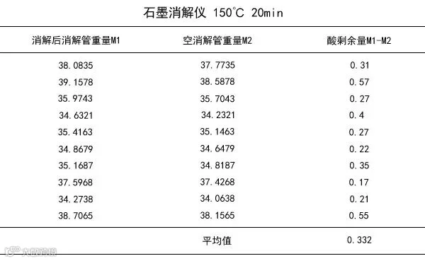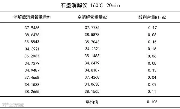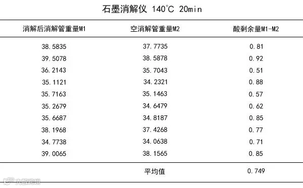 (1)经过大量实验,就其消解后酸剩余量和定容结果的感观指标看,最佳温度为150℃,良好消解时间为20分钟。