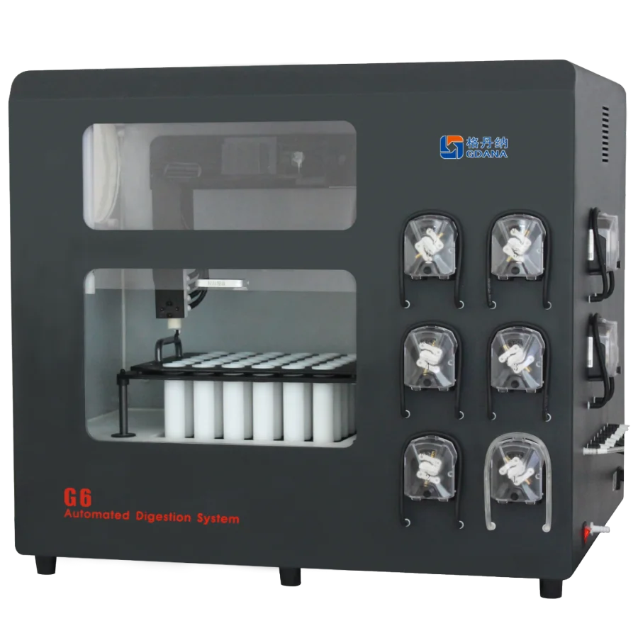 格丹纳G6全自动石墨消解仪是集自动加酸、消解、赶酸、摇匀、定容和酸雾排放等全过程的智能一体化消解仪器。实验人员也不用全程守候在旁,全自动石墨消解仪可以自动完成消解全过程,做到真正解放实验人员的双手,克服消解时间长、消解不彻底、消解后需移动赶酸等不足,大大提高工作效率。