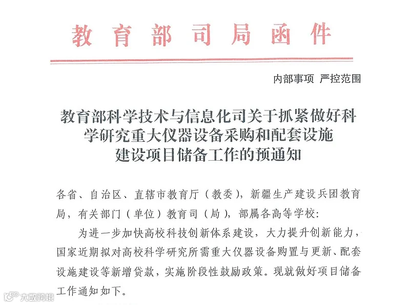 近日,教育部对于高校创新体系建设做出新指示。教育部科学技术与信息化司发布《关于抓紧做好科学研究重大仪器设备采购和配套设施建设项目储备工作的预通知》(以下简称《通知》),拟对高校科学研究所需重大仪器设备购置与更新、配套设施建设等新增贷款,鼓励支持国家和省部级各类穿心平台的高校完善现有科研设备,开展重大仪器设备购置与更新、配套设施建设。