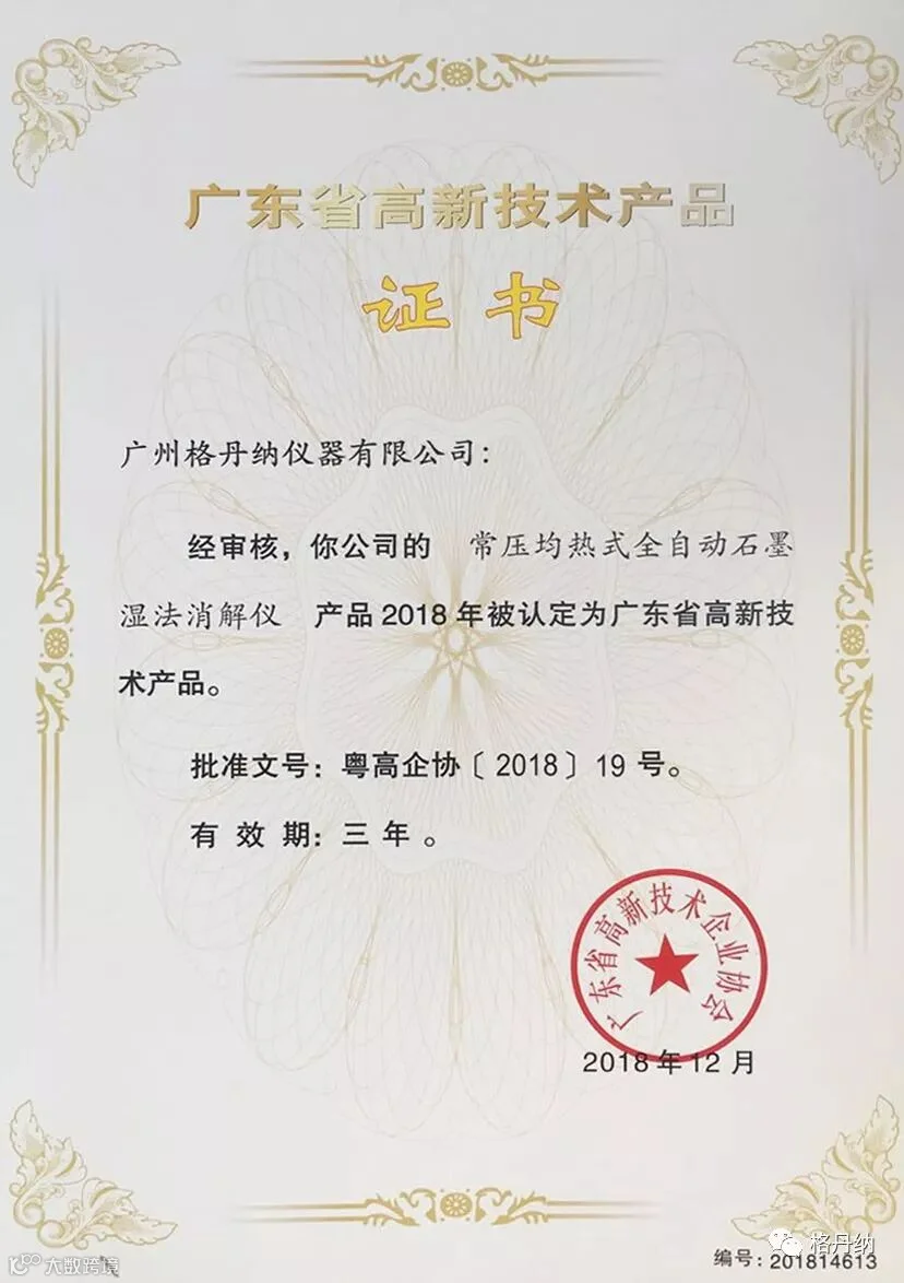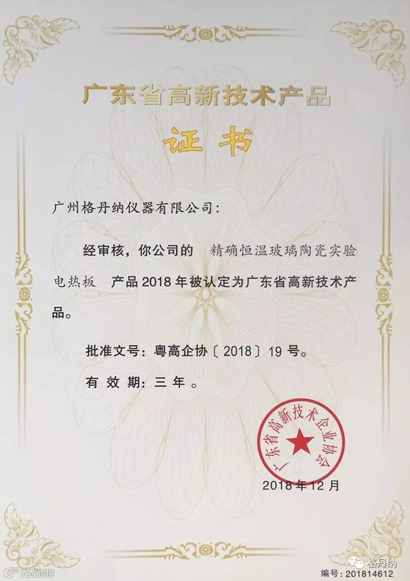 2018年的12月,广东省高新技术企业协会启动了广东省2018年高新技术产品的评定工作。经广东省高新技术企业协会严格审核,格丹纳的“常压均热式全自动石墨湿法消解仪”、“精确恒温玻璃陶瓷实验电热板”两项产品荣获《广东省高新技术产品》称号。