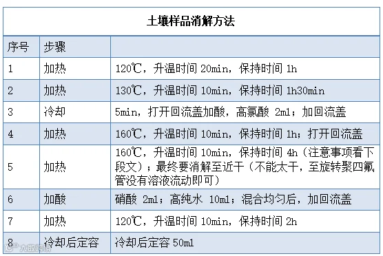 步骤5需要注意观察溶液状态,如果出现了溶液变棕色或黑色出现干烧情况,就需要补加 2ml硝酸继续下一步骤,延长消解时间;若还发现溶液底部还有固体颗粒就需加 2ml硝酸和 1ml高氯酸。