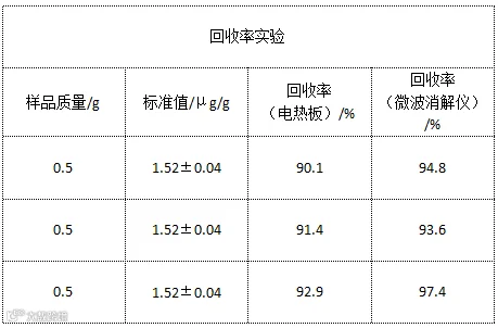 测试回收率,我们将3份植物样品标准物质精密称量每份0.5g,再各添加1 μg/g的镉标准溶液。分别采用微波消解和电热板消解的方法,对镉含量回收率进行计算,回收率=(加标样品浓度-没加标样品的浓度)/标准浓度*100%,结果如下表。微波消解和电热板消解对比可见,镉有更好的回收率。