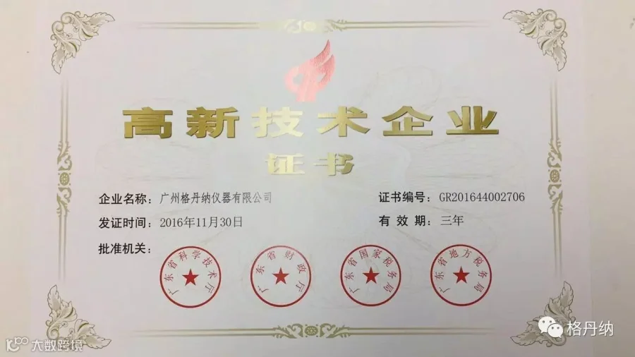 近日,广州格丹纳仪器有限公司收到“广东省科学技术厅”颁发的“高新技术企业”的证书,这意味着公司的经营发展又上了一个更新的台阶,我们将会继续努力创新,以优质的产品和服务来回报社会。