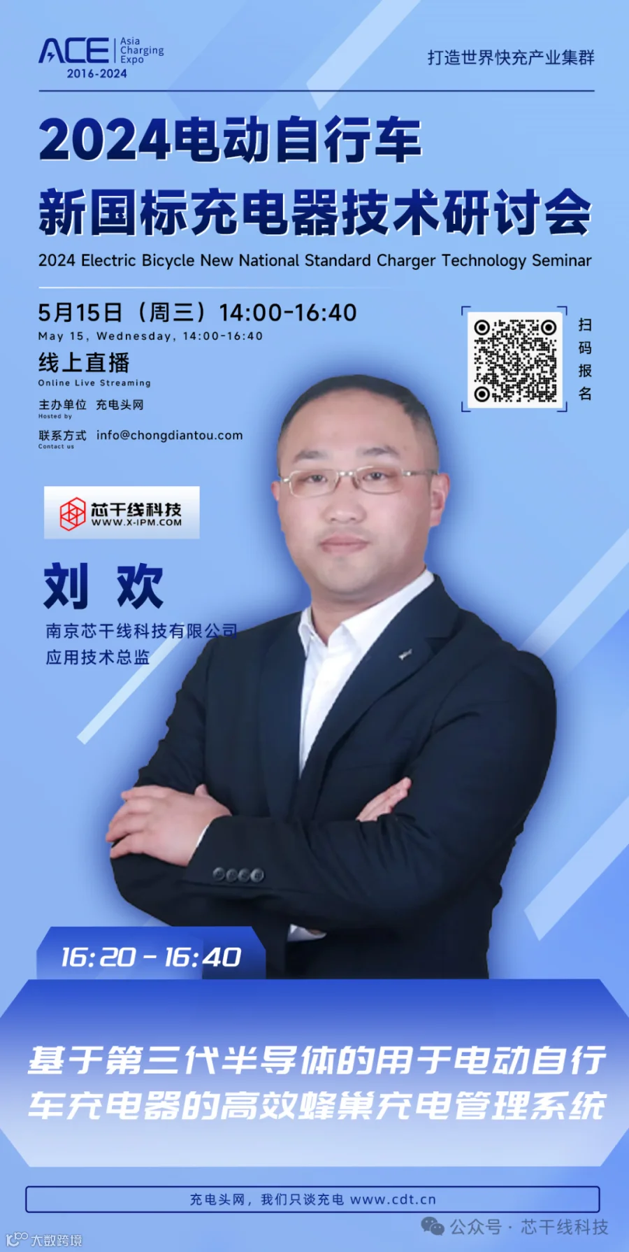 5月15日,由充电头网举办的“2024电动自行车新国标充电器技术研讨会”将于14:00-16:40在“充电头网”公众号平台进行直播。
