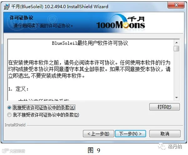 3. 系统弹出安装协议界面,点选“我接受许可证协议中的条款”,然后单击“下一步”继续安装,如图9所示: