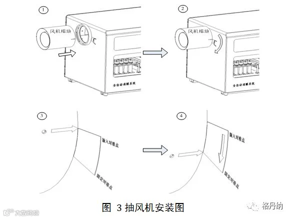 将抽风机的上的指示标志先对准仪器外壳上的标记点,插入对应卡位,然后顺时针转动抽风机直到抽风机的上的指示标志对准固定点的指示标志,如图3所示: