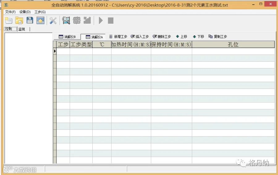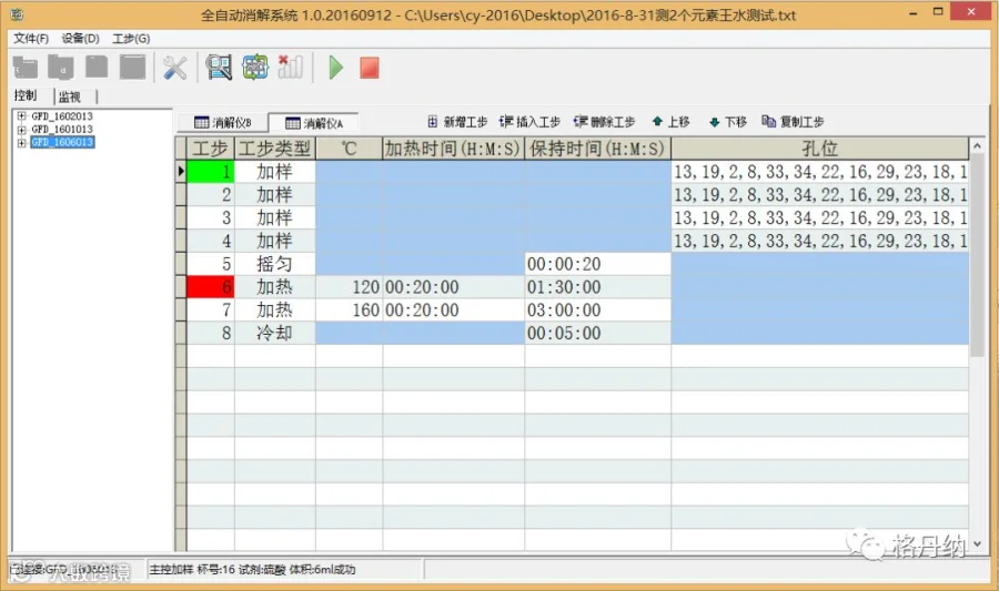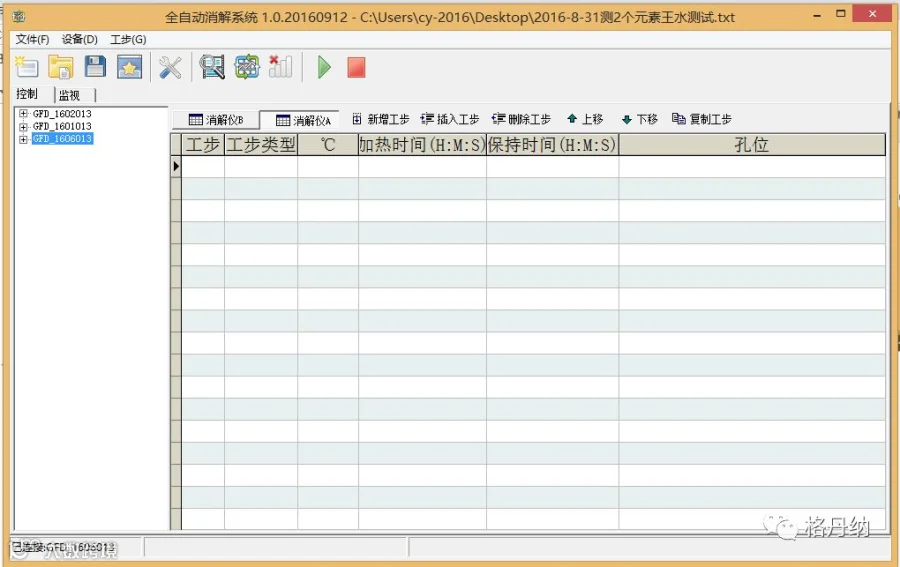点击如图36中红色框所示位置选择“消解仪A”或“消解仪B”,图36为选中“消解仪A”状态,然后在工步编辑区编辑工步,完成后点击