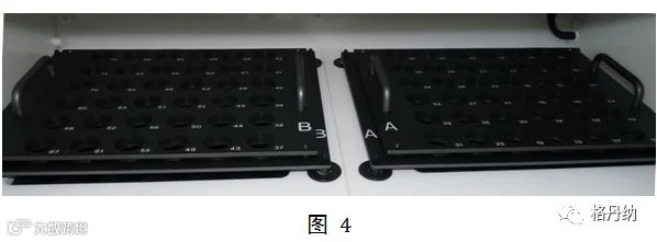 ②消解管板B上孔的编号为36~72,板的右下方有标识“B”,放置消解管板时,标识“B”应与支架上的标识“B”位置相对应(同在右下方),如图4所示: