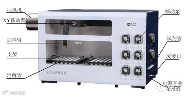 全自动消解仪是基于蓝牙无线控制技术,通过电脑监控消解仪的运行情况和实验情况,集自动加酸、自动摇匀、自动定容等功能于一身的高端消解设备。实验人员只需将样品放置在仪器内部的消解管架上,系统会按照预先设定的程序执行实验步骤,实验人员可远离酸雾环境,实现远程监控,同时也保护了实验人员的健康。本仪器配备两套独立消解系统,每套可单独处理36个样品,两套系统最大批处理量共为72个样品,方便用户对不同样品不同批量的处理要求,特别是可独立操作的两套消解系统,实验人员可以自行选择其中一套或两套进行实验,满足实验人员的人性化需求。此仪器可广泛应用于生物、化学、环保等行业的样品分析测试前处理。