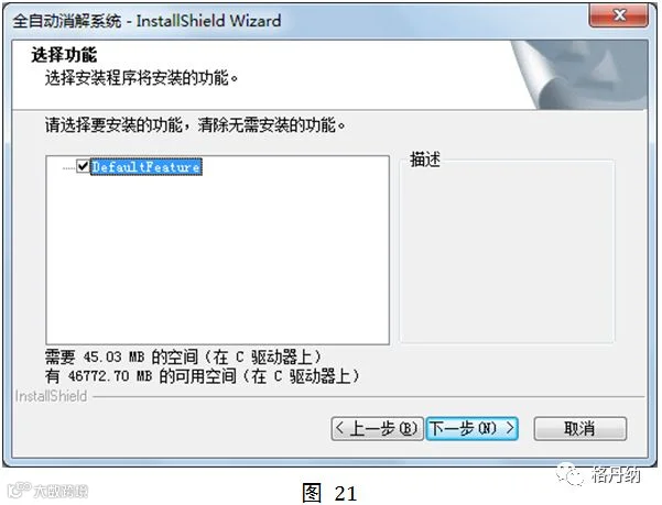 6.系统弹出定制选择界面,点选“DefaultFeature”,单击“下一步”继续安装,如图21所示: