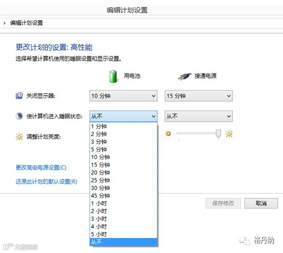 D.点击“更改计算机睡眠时间”,进入如图36所示界面,在“使计算机进入睡眠状态”的两个下拉选项中选择“从不”选项,然后点击“保存修改”即可。