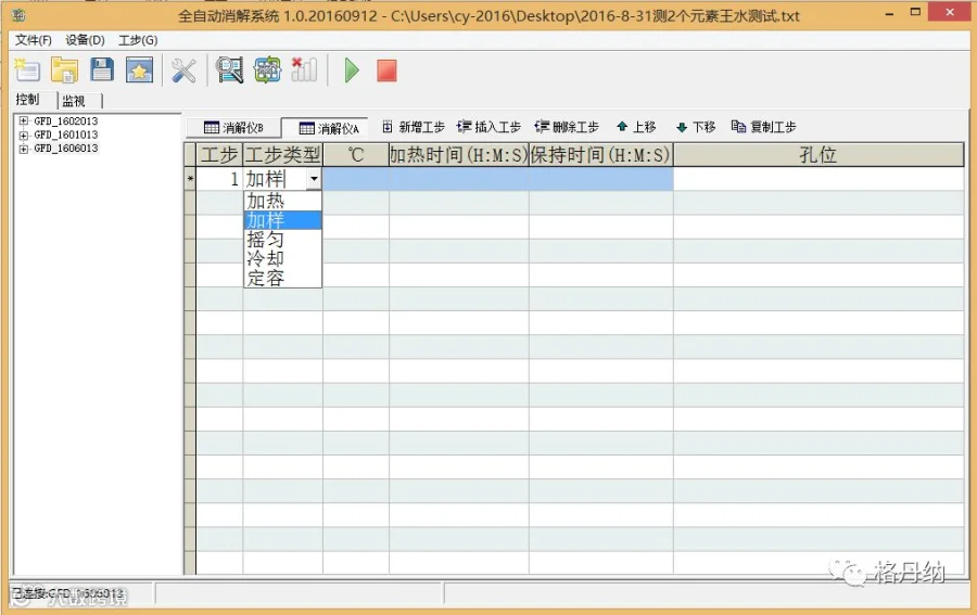 首先选择“消解仪A”或“消解仪B”进行样品处理,点击“工步类型”下的表格,变成下拉选项,此时可以选择“加热、加样、摇匀、冷却、定容”操作,如图46所示: