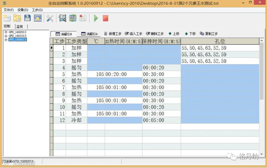 ② 选择两台消解设备设置不同工步进行消解实验:点击选择“消解仪A”设置工步;完成后点击选择“消解仪B”设置工步,完成后点击