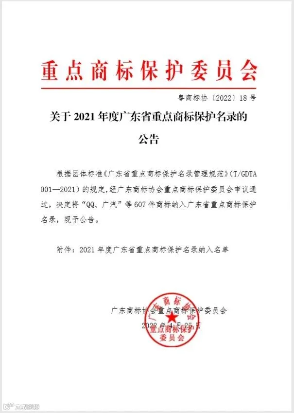 近段时间,根据团体标准《广东省重点商标保护名录管理规范》的规定,经广东商标协会重点商标保护委员会审议通过,公布了“2021年度广东省重点商标保护名录”。