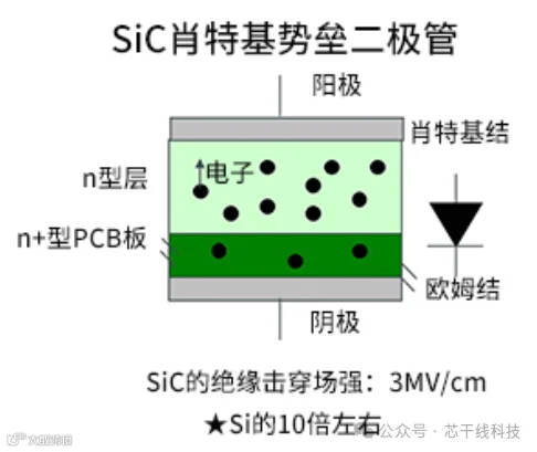 碳化硅肖特基二极管(SiC SBD)是一种由碳化硅(SiC)材料衬底制成的肖特基二极管,属于一种单极型功率器件。SiC SBD具有高耐压、快速开关特性、低正向压降和高温稳定性等优点,因此在高压、高频、高温等恶劣环境下有着广泛的应用。