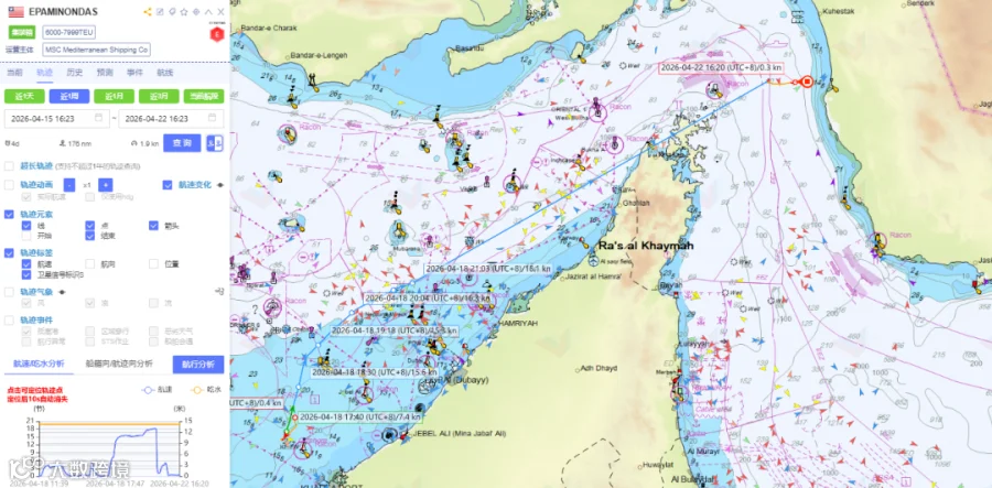 结合船舶 AIS 航行轨迹数据交叉溯源,本次遇袭船舶基本确认为 MSC 旗下运营的EPAMINONDAS 轮。该船为 6690TEU 级别大型集装箱船,航行轨迹显示,该轮于 4 月 18 日关闭船舶自动识别系统(AIS)信号,在长时间信号失联后,于本次事发当日重新开启 AIS 信号,位置现身于霍尔木兹海峡以东海域;信号恢复仅 1 小时,该船航行轨迹便显示驶入伊朗 #01 专属管控海域
