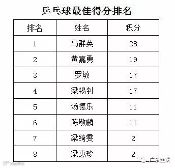 今日乒乓球赛赛果以及个人积分排行榜如下:
