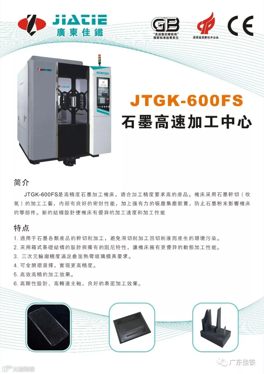 JTGK-600FS 是高精度石墨加工机床,适合加工精度要求高的产品。机床采用石墨干切(吹气)的加工工艺,内部有良好的密封性能,加上强有力的吸尘集尘装置,防止石墨粉末影响机床的零部件。新的结构设计使机床有优异的加工速度和加工性能。