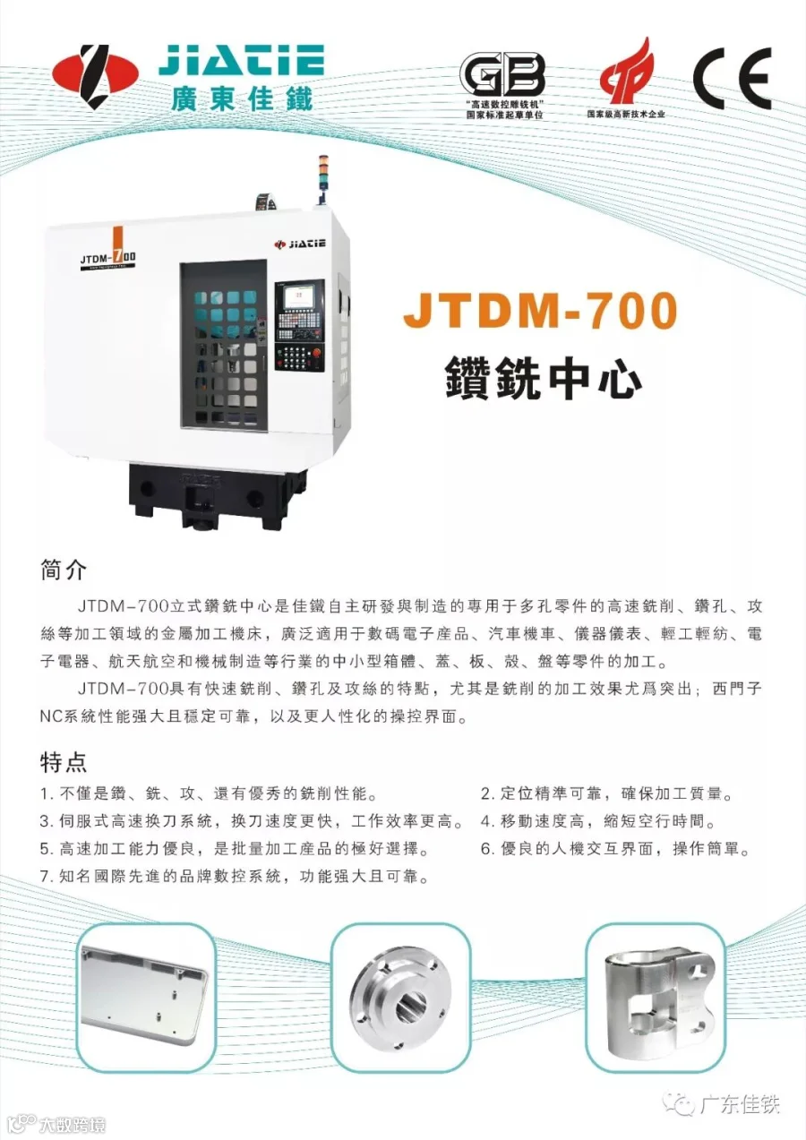JTDM-700立式钻铣中心是佳铁自主研发与制造的专用于多孔零件的高速铣削、钻孔、攻丝等加工领域的金属加工机床,广泛适用于数码电子产品、汽车机车、仪器仪表、轻工轻纺、电子电器、航天航空和机械制造等行业的中小型箱体、盖、板、壳、盘等零件的加工。
