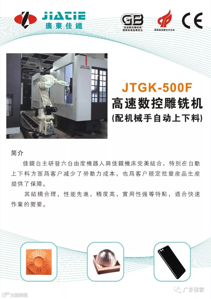 JTGK-500F是佳铁的新款高速数控雕铣机。其主要用于脆硬材料的产品加工,又有良好的加工速度和加工效果。该机床在结构布局、占地面积都做了优化,更适合自动化的排布。机床提升了刀库的刀具容量,换刀时间短,适合加工复杂的产品以及加工工艺。主要适合加工产品为玻璃、陶瓷、蓝宝石等。
