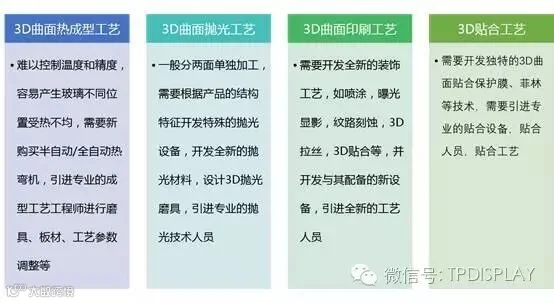 3D玻璃难度主要体现在3D曲面成型、曲面抛光、曲面印刷、曲面贴合四大工艺上。