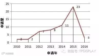 首先看一下该技术的发展趋势:2.5D玻璃、3D玻璃的前期研发出现在2010年左右,随后专利数量稳步增加。2014年,随着2.5D玻璃在苹果、三星等主流手机上的推广应用,该领域的专利申请量呈现迅猛增长,2015年更是达到23件,预计未来依然涨势强劲。