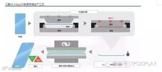 弧形模具之间,加热到800摄氏度,再压进弧形模具让玻璃弯曲,然后再通过CNC加工、三面抛光、强化等步骤。热成型过程中温度和精度难以控制,玻璃的不同部位容易产生受热不均。模具目前多用石墨,属于耗材易损耗,更新频率高。此过程工艺复杂且人力成本高,因此S6 Edge初期也曾一度有良率仅50%和供货不足的传闻。