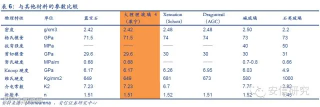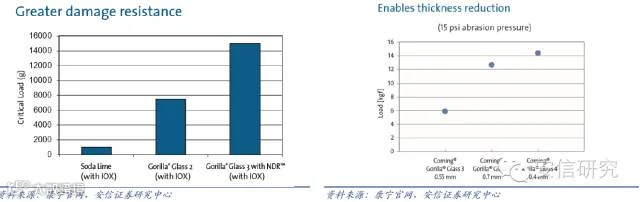 就大家担心的容易跌碎的问题,玻璃材料进行了大量技术升级,能够应用于正常的外观件使用。14年推出的大猩猩玻璃4是康宁迄今为止最坚硬的产品,主要提高的就是设备跌落时的防护能力,坚韧程度比竞争对手高两倍,在相同测试中完好率达到80%,同时在耐磨性方面提升两倍。以大猩猩4代与大猩猩3代对比看,大猩猩4在0.4mm至1mm甚至更宽的厚度区间,均比大猩猩玻璃3具有更强的抗摔能力,负荷比大猩猩3更大的情况下,大猩猩4的厚度还可以减少约0.3mm。在凹陷实验中,15psi对大猩猩3造成75微米的凹陷,而同样的磨损度加在大猩猩4上只造成了35微米的凹陷。我们相信随着玻璃在外观件的应用,玻璃的技术升级不会停止,而且上一次从3代玻璃升级至4代玻璃是14年期间,因为没有发生下游应用方面的变化,因此之后两年没有显著升级,如果出现应用端的需求变化,材料供应商预计会同步升级。