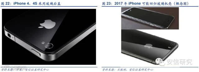 虽然大量的智能手机采用3D盖板作为显示屏,但是根据产业链判断,3D后盖预计将是国际大客户新品将采用的方案,历史的滚滚洪流唯一不变的是轮回。玻璃→金属→玻璃这看似荒唐的变化其实诉说的是一个真理,周期性的变化就是时尚,当你拿出80年代的喇叭裤,高喊经典复古的时候,你就能理解外观的复古将会带来一场新的销售革命。苹果手机的销售增速在6S发布后遇到问题,没有创新成为消费者最为诟病的问题,我们认为后盖采用3D玻璃可能是会带来显著销售增长的创新。iPhone 4和4S的玻璃后盖依旧经典,从iPhone 5开始的金属机壳带来CNC的发展机会,一批CNC加工厂商崛起。如果以两种不同的架构看,iPhone 4时代,手机普遍采用三明治结构,两层玻璃中间夹中框,iPhone6时代,金属机壳的一体化设计将内部完全包裹在内。从玻璃行业的发展看,目前加工一体化成型依旧较难,因此预计未来可能采用的方式是双玻璃夹金属中框的方式。