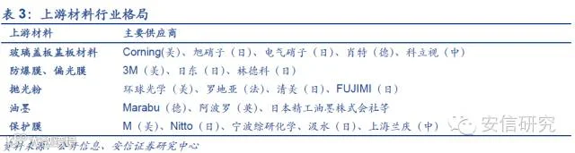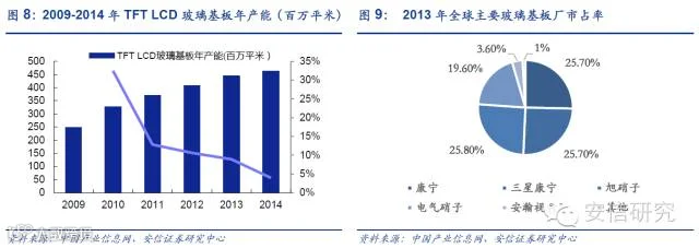 玻璃基板是显示的核心材料,无论是TFT、LTPS还是近期火热的OLED,都离不开玻璃的需求。平板显示玻璃基板行业属于技术密集型和资本密集型行业,制造技术要求高,产品工艺复杂,技术壁垒高,资本投入巨大,具有很高的进入壁垒。目前,全球只有美国的康宁、日本的旭硝子、电气硝子、安瀚视特和国内的东旭集团、彩虹股份等在内的少数几家企业掌握了平板显示玻璃基板的全套生产技术,其中美国康宁公司占据了大部分的市场份额。根据中国产业信息网研究报告,2013年TFT LCD玻璃基板面积产能将达到4.4亿平方米。其中合并三星康宁计算,康宁的市场占有率达到50%;旭硝子的市场占有率达到25.8%;电气硝子的市场占有率达到19.6%,安瀚视特的市场占有率为3.6%;其他仅为1%。