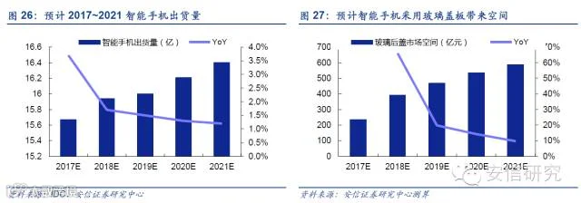 假设明年开始智能手机开始逐步渗透玻璃后盖设计,那么将带来远超现有盖板玻璃的市场空间,理想情况是现有市场的3倍!此次重新回归玻璃设计,单价方面预计会是iPhone 4时代的3倍以上,目前良率极低,预计在下半年至明年将是研发提升良率的过程。我们对玻璃后盖市场进行测算,考虑到后盖相比正面玻璃加工难度更小,同时因为暂时不做显示用途,因此无论价格还是降价速度预计够快于正面3D盖板。根据明年国际大客户可能采用3D玻璃后盖,其他厂商高端机型预计将快速跟进,玻璃产业将跨越式发展,预计至少新增200亿市场。考虑18年良率继续提高和设备需求的平缓,渗透率将继续提升,预计有望实现近400亿的销售市场。