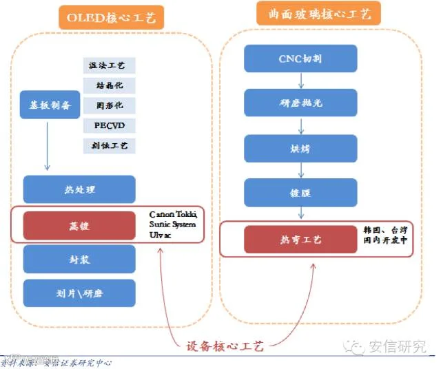 如果做过OLED研究就会知道蒸镀设备的产能限制了OLED的总体产能,Canon Tokki的设备交货周期甚至要到18年,玻璃加工设备将遇到同样的情况!蒸镀工艺将RGB色素点“汽化”继而附着在玻璃/塑胶基板上,是RGB OLED生产中最核心的工艺。蒸镀工艺对技术精度要求极高,目前整个市场基本上被日本Canon Tokki、Ulvac、韩国Sunic System等几家占据。目前Canon Tokki的产能已经非常吃紧,交货甚至已排到2018年在OLED下游市场跨越式增长初期,上游核心设备其实是投资的核心,远超材料的弹性空间!同样的情况可以类比到3D玻璃产业。目前大量采用3D盖板的三星主要采用韩国设备,而曲面玻璃核心工艺设备——热弯设备供应主要由韩国及台湾厂商占据,但是因为工艺相对蒸镀简单,国内厂商已有研发突破。热弯工艺设备与蒸镀设备类似,目前处于限制产能和良率的关键,作为原有2.5D和2D玻璃外的新增设备,弹性空间巨大。根据我们对于行业空间的测算,预计一年设备销售空间近百亿,而设备的利润率有望达到30%以上!