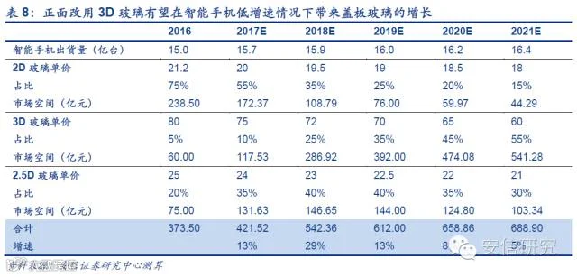 曲面玻璃目前单价大约是传统盖板玻璃单价的3倍,智能手机增速大幅下滑的情况下,正面3D玻璃的渗透率上升将带来行业的显著增长。我们仅以智能手机测算,预计行业整体空间接近400亿,如果算上维修市场等,将是上千亿的市场容量。17-18年预计会出现3D玻璃盖板伴随OLED的大面积渗透,将带来行业的整体增长,特别是在18年预计OLED产能完全释放后,高端旗舰机型将大量采用3D玻璃,整体行业增速有望达到近30%。