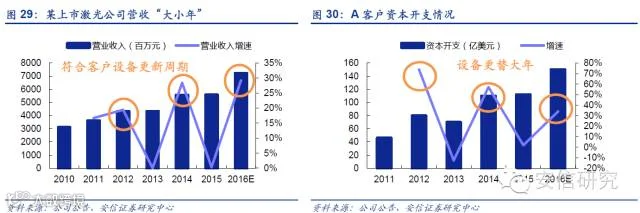 传统理解制造设备至少5年折旧,但是事实告诉我们,随着智能硬件两年大升级,设备的更新周期是两年,终端客户资本支出和设备供应商都将出现周期性大增长。以手机为代表的消费电子领域,尤其是高端消费电子领域,产品加工设备往往跟随设计改变,如果新款手机的外形、材质、结构发生大的变化,设备一般需要更新。以为A客户的重要激光设备供应商为例,A客户的手机每个两年进行一次大的革新:12年手机从4代变革为5代,手机尺寸由3.5寸升级为4寸;14年手机从5代变革为6代,手机尺寸由4寸升级为4.8寸和5.5寸两个版本;而16年伴随A客户手机升级为7代,预计又会有显著变化,公司的资本也将出现周期性变化。设备供应商的营收也伴随大客户的产品革新产生“大小年变化”。14年是A大客户产品外形革新的重要一年,其来自大客户的订单达到17亿左右,较13年增长50%以上。而15年大客户推出6s及6s plus与14年6及6 plus外形变化不大,故对新设备需求下降,15年来自大客户的订单回落,今年预计整体将实现30%增长,大客户订单有望再次回到50%以上增长。而从A客户本身的资本开支也印证了我们的观点。A客户偶数年资本开支增速明显高于奇数年,16财年其资本开支增速预期达到150亿美元,相较15财年提升30%以上。因此我们认为,A客户的设备更新周期仅仅两年。而消费电子创新升级加速推进,今年7明年8的情况预计会出现,设备投资周期会进一步缩短。