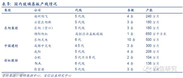 国内企业方面,随着国内企业、研究机构的长时间的研发,国内企业在玻璃基板制造的技术不断突破。近几年,彩虹股份、东旭集团等在国内不断设立玻璃基板厂。彩虹股份在咸阳、合肥、张家港等地设立产线,彩虹股份的规划产能为13条5代线、6代线。东旭集团在成都、绵阳、郑州、石家庄、芜湖、营口、武汉等地纷纷建立玻璃基板生产线,其规划产能为郑州旭飞4条5代线、石家庄旭新3条5代线、东旭(营口)3条5代线、芜湖东旭光电10条6代线、绵阳旭虹1条高铝浮法盖板玻璃线。中国建材集团旗下的成都中光电已建成3条4.5代线。
