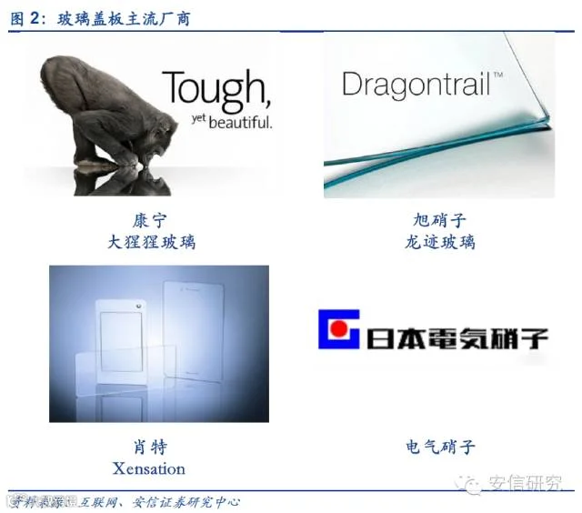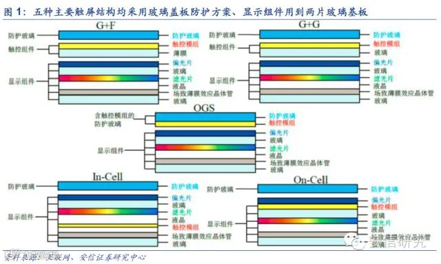 视窗防护玻璃,也就是通常所说的玻璃盖板是电子行业目前玻璃应用最为广泛的领域,也造就了蓝思、伯恩等一批优质企业。玻璃盖板(视窗防护屏,Cover Lens)是目前触控技术、显示面板的主流保护方案。其是被加之于显示屏外、用它具有强度高、透光率高、韧性好、抗划伤、憎污性好、聚水性强等特点,其内表面须能与触控模组和显示屏紧密贴合、外表面有足够的强度,达到对平板显示屏、触控模组等的保护、产品标识和装饰功能。于对触摸屏的触控模组、显示屏和对非触摸屏的显示屏进行保护的透明镜片。目前触摸屏有GF、GG、OGS/TOL、In-Cell、On-Cell 等5 种主要结构,五种结构的最外层均采用玻璃盖板。