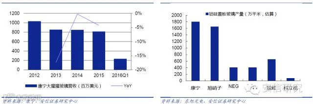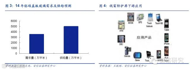视窗防护屏的下游应用行业较为广泛,如康宁的大猩猩玻璃已经用在45亿台设备上。包括手机、平板电脑、笔记本电脑、桌上电脑、数码相机、播放器、游戏机、数码相框、家电、工业仪表、汽车仪表盘等带有平板显示器件的产品。随着电容式触摸屏在通讯终端、数码产品、家用电器、仪器仪表等下游行业中的普及和玻璃加工技术的成熟,视窗防护屏的产品类别和应用范围也将随之扩大,行业市场规模将持续迅速增长,市场前景广阔,但是可以看到,根据东旭光电的测算,14年行业的整体供给已经满足需求量,铝硅盖板玻璃材料的突破空间有限,几大厂商几乎垄断产能和销售。目前除了使用广泛的康宁大猩猩玻璃外,旭硝子、肖特、电气硝子等厂商都有高铝玻璃产能,行业整体供给稳定。