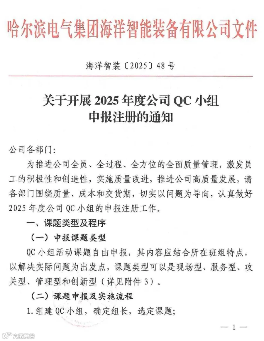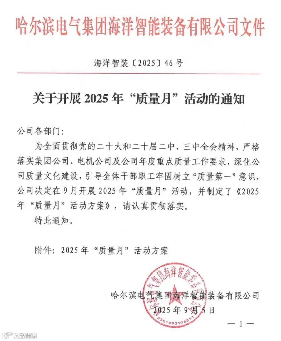 9月初,海洋智装公司发布了《关于开展2025年“质量月”活动的通知》,明确了相关活动内容。