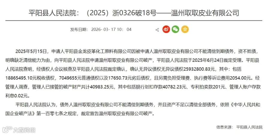 严重资不抵债,温州这家皮革公司破产