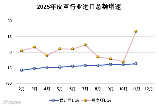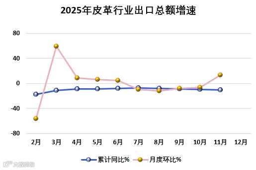 2025年1-11月全国皮革行业出口额同比降幅继续加大,进口总额同比收窄