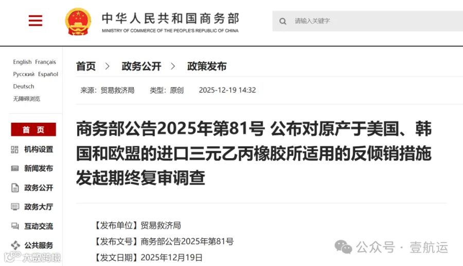 据壹航运最新获悉:12月19日,中国商务部在官网公布,对原产于美国、韩国和欧盟的进口三元乙丙橡胶所适用的反倾销措施,发起期终复审调查。